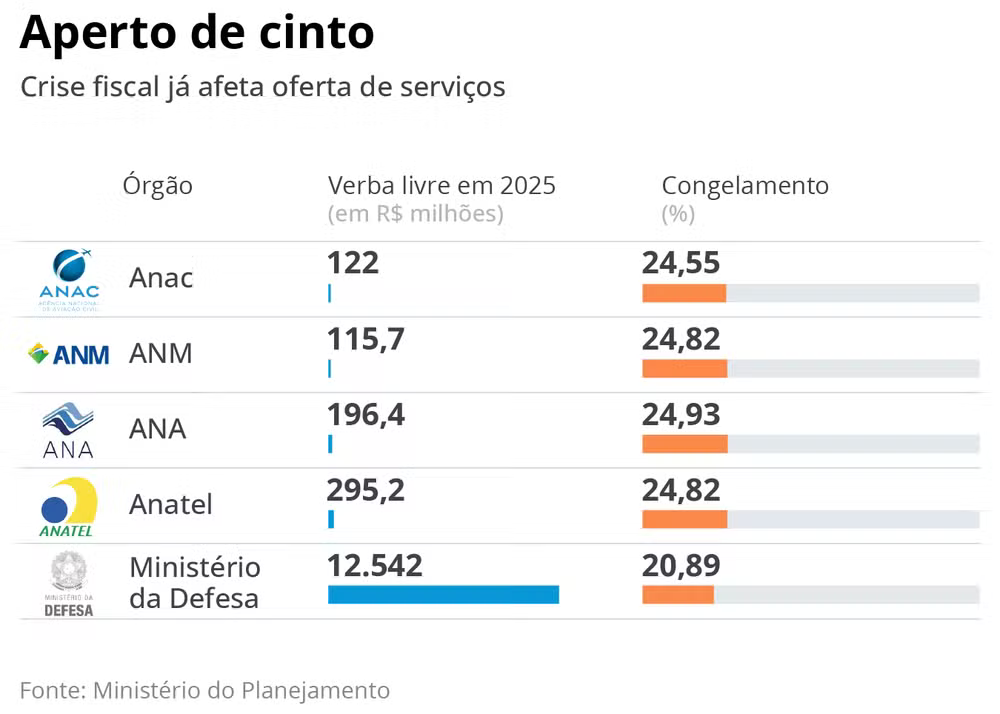 Entre os mais afetados estão as agências reguladoras, que perderam, em média, 25% do orçamento de 2025. O impacto é generalizado: a Anatel paralisou projetos contra pirataria e desinformação; a ANM, que fiscaliza barragens e lavras ilegais, opera no limite; a ANA, responsável por monitorar secas e enchentes, cortou manutenções essenciais; e a Aneeldemitiu mais de 140 terceirizados e alerta para riscos no fornecimento de energia elétrica.
