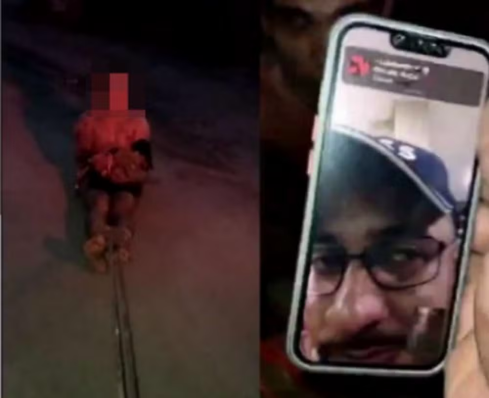 - Homem amarrado e arrastado por um carro, enquanto implora por perdão.