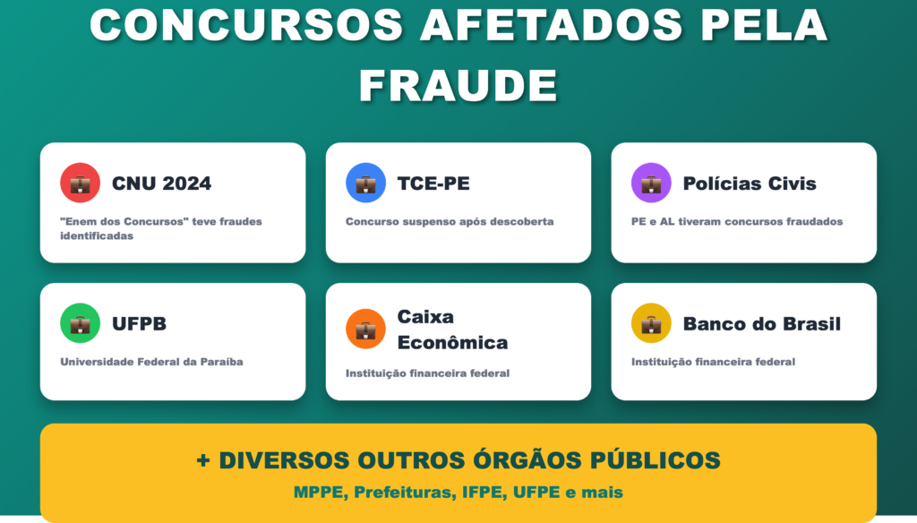 As investigações também miram fraudes em seleções das Polícias Civis de Pernambuco e Alagoas, da Caixa Econômica Federal, Banco do Brasil e Universidade Federal da Paraíba.