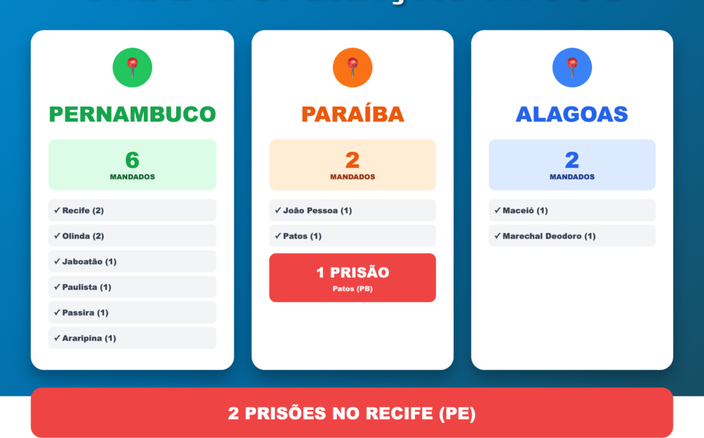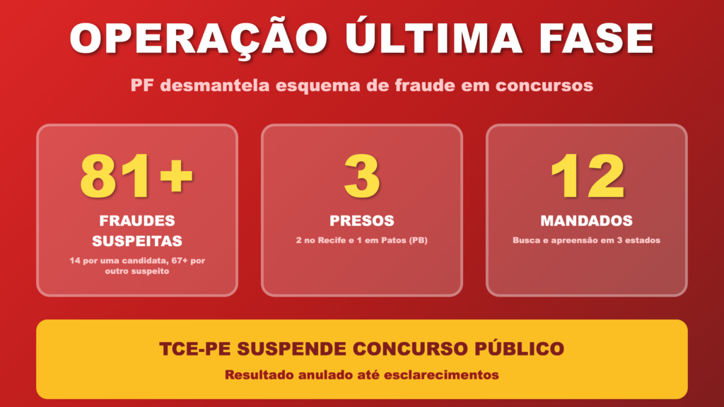 A Operação Última Fase, deflagrada em 2 de outubro, cumpriu 12 mandados de busca e apreensão e 3 prisões preventivas em Pernambuco, Alagoas e Paraíba. No estado, as ações ocorreram em Recife, Olinda, Jaboatão dos Guararapes, Paulista, Passira e Araripina. A PF apreendeu veículos, computadores, celulares e dinheiro em espécie.