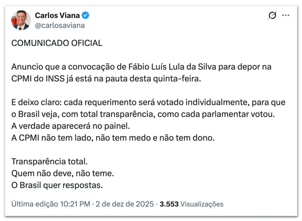 “A CPI não tem lado, não tem medo e não tem dono. Transparência total. Quem não deve, não teme. O Brasil quer respostas”, afirmou Viana nas redes sociais.