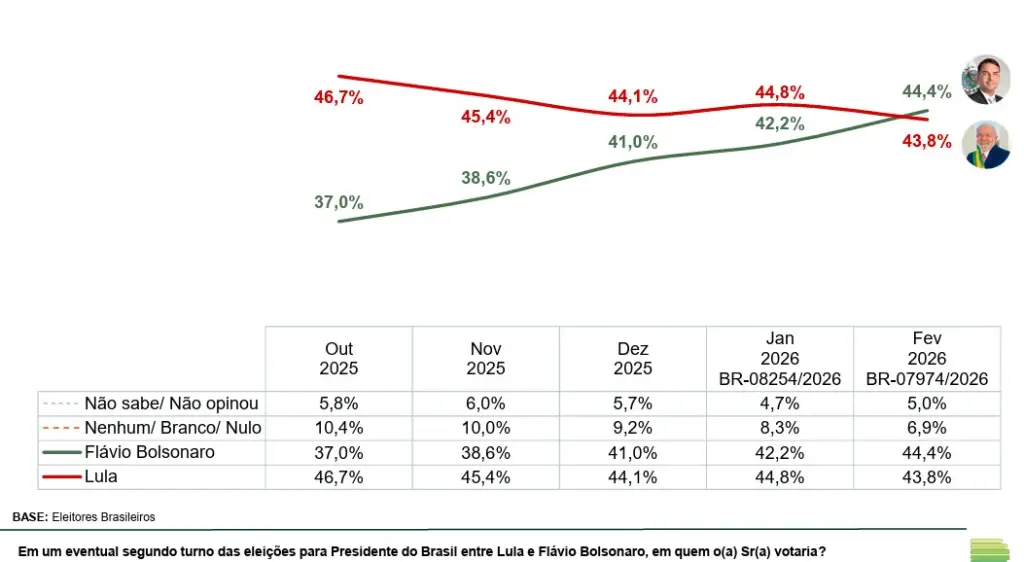 Embora tambĂ©m configure empate tĂ©cnico, o dado chama atenção pela tendĂȘncia: em comparação ao levantamento de janeiro, Lula recuou 1 ponto, enquanto FlĂĄvio avançou 2,2 pontos percentuais.