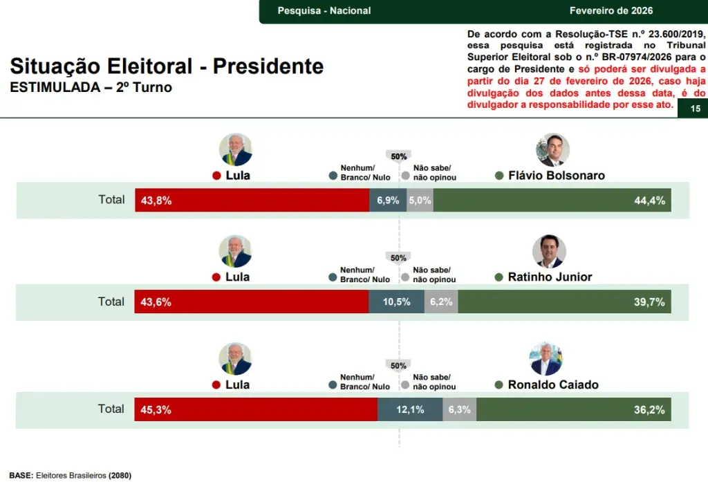 Em eventual disputa entre Lula e Ratinho JĂșnior, o presidente aparece com 43,6%, contra 39,7% do governador paranaense — tambĂ©m empate tĂ©cnico.