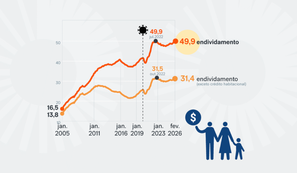 O nível de endividamento das famílias brasileiras atingiu o maior patamar da história, segundo dados divulgados nesta segunda-feira (27) pelo Banco Central do Brasil. Em fevereiro de 2026, o índice chegou a 49,90%, superando o recorde anterior registrado em julho de 2022.