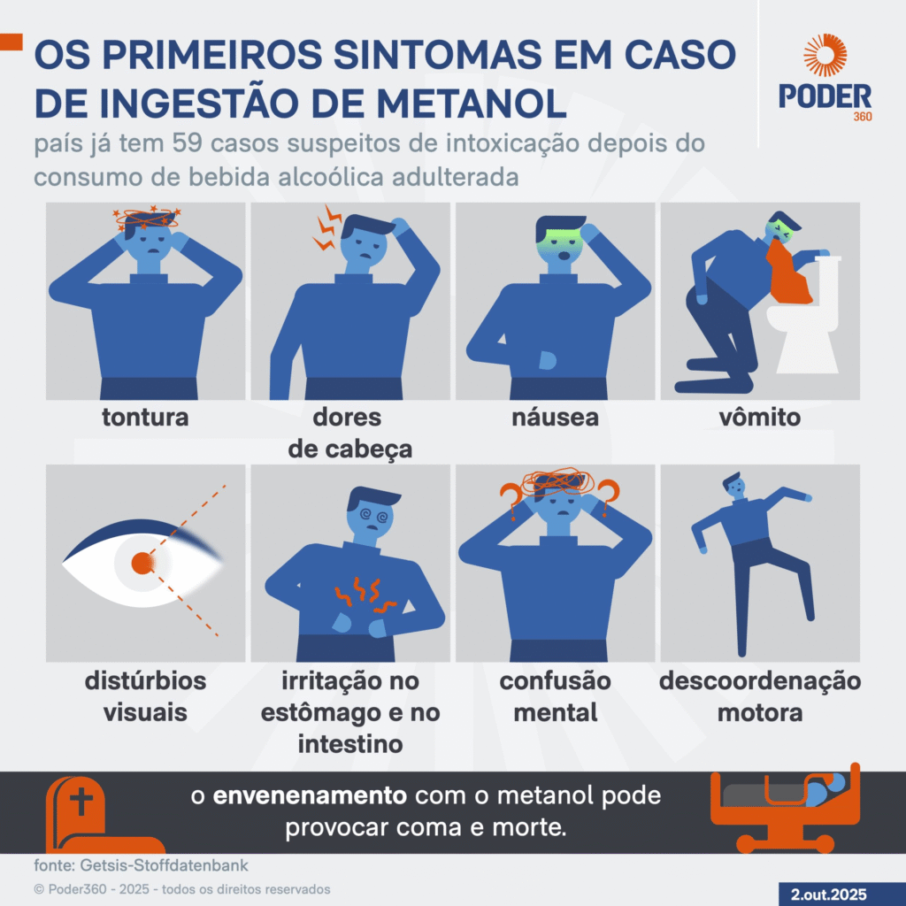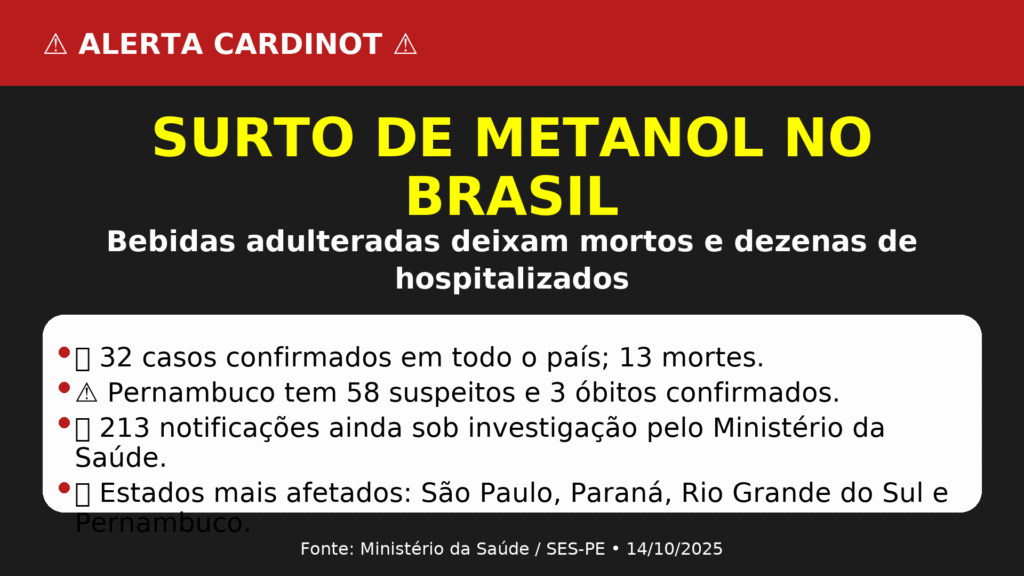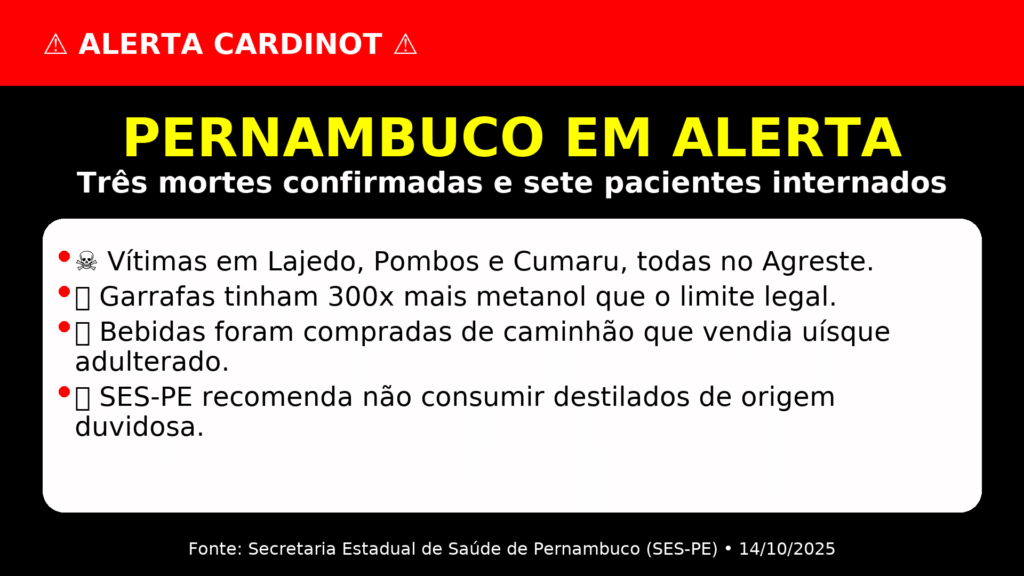Pernambuco confirmou três mortes e investiga 29 casos de suspeita de intoxicação por metanol, substância altamente tóxica usada ilegalmente para adulterar bebidas. Segundo a Secretaria Estadual de Saúde (SES), já são 58 notificações desde o fim de setembro — dez delas registradas só nesta segunda (13). Entre os novos casos, há três mortessete internações e dois pacientes que já tiveram alta.