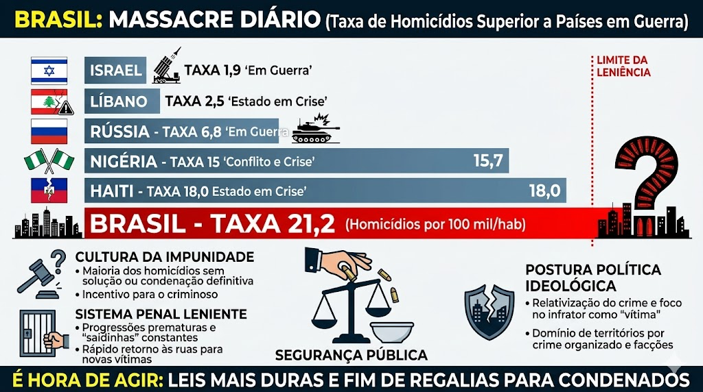 O Brasil registrou uma taxa de 21,2 homicĂdios por 100 mil habitantes, segundo o Atlas da ViolĂȘncia 2025. O Ăndice supera o de paĂses que enfrentam conflitos armados ou crises institucionais graves, como RĂșssia, Israel, Haiti e LĂbano.