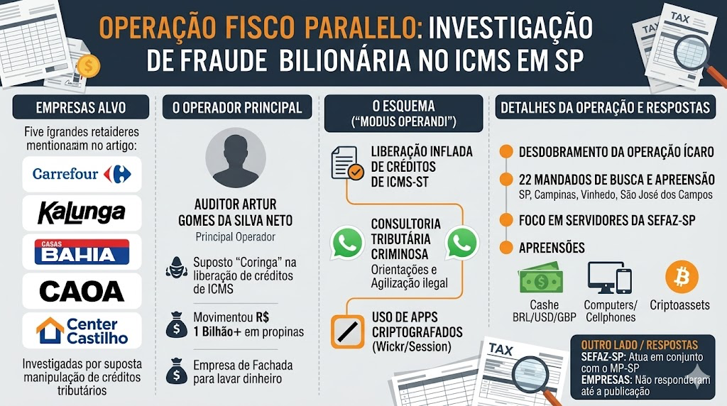 A investigação é um desdobramento da Operação Ícaro, iniciada em agosto de 2025, que revelou um esquema de pagamento de propinas a auditores fiscais para acelerar a liberação de créditos de ICMS para grandes redes varejistas, como: