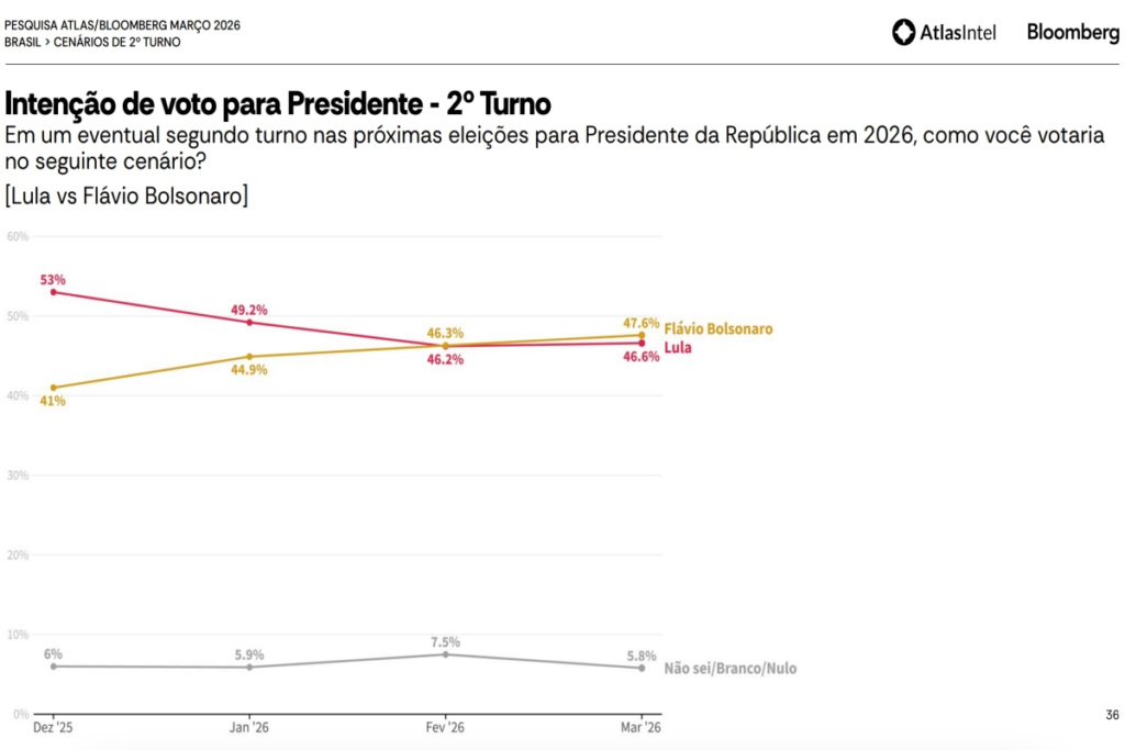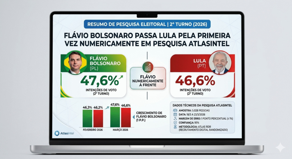 Uma nova pesquisa da AtlasIntel divulgada nesta quarta-feira (25) aponta que o senador Flávio Bolsonaro aparece numericamente à frente do presidente Luiz Inácio Lula da Silva em um eventual segundo turno das eleições de 2026.
