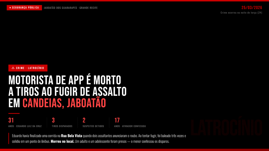 Um motorista por aplicativo de 31 anos, identificado como Eduardo Luiz da Cruz, foi morto a tiros ao tentar escapar de um assalto na noite desta terça-feira (24), no bairro de Candeias, em Jaboatão dos Guararapes, Região Metropolitana do Recife.