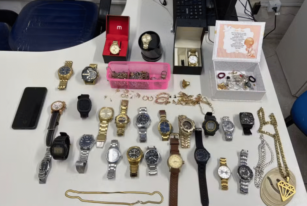 Durante a operação, os policiais apreenderam uma grande quantidade de itens, incluindo dezenas de relógios, cordões de ouro e prata, anéis, brincos e outros acessórios, que podem estar ligados aos crimes investigados.