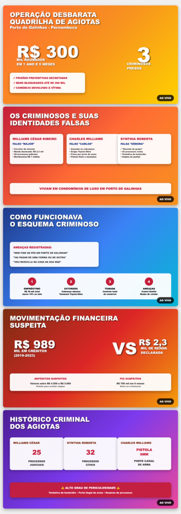 A Polícia Civil de Pernambuco prendeu três agiotas acusados de comandar um esquema milionário de extorsão no balneário de Porto de Galinhas, em Ipojuca. Segundo as investigações, o grupo cobrava juros abusivos em empréstimos informais e chegou a tomar estabelecimentos comerciais de vítimas.