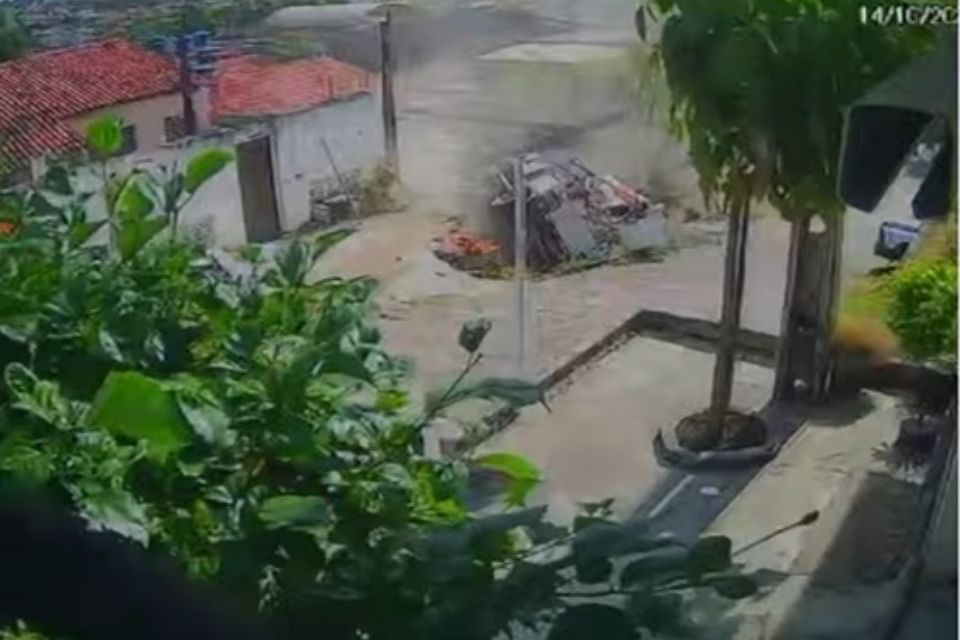 Câmeras de segurança registraram o momento do acidente. As imagens mostram o veículo em alta velocidade, descendo a rua até colidir com o muro e tombar. O caminhão era ocupado por dois eletricistas da distribuidora.