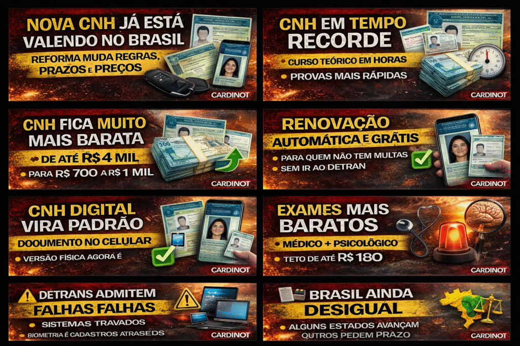 Em poucos dias, o Brasil registrou a primeira carteira emitida no novo formato, prova teórica aplicada em tempo recorde e relatos de redução expressiva no custo para o candidato. Ao mesmo tempo, Detrans afirmam que a implementação foi acelerada, com sistemas ainda instáveis e etapas que não funcionam plenamente, como biometria, abertura do Renach e credenciamento de instrutores autônomos.