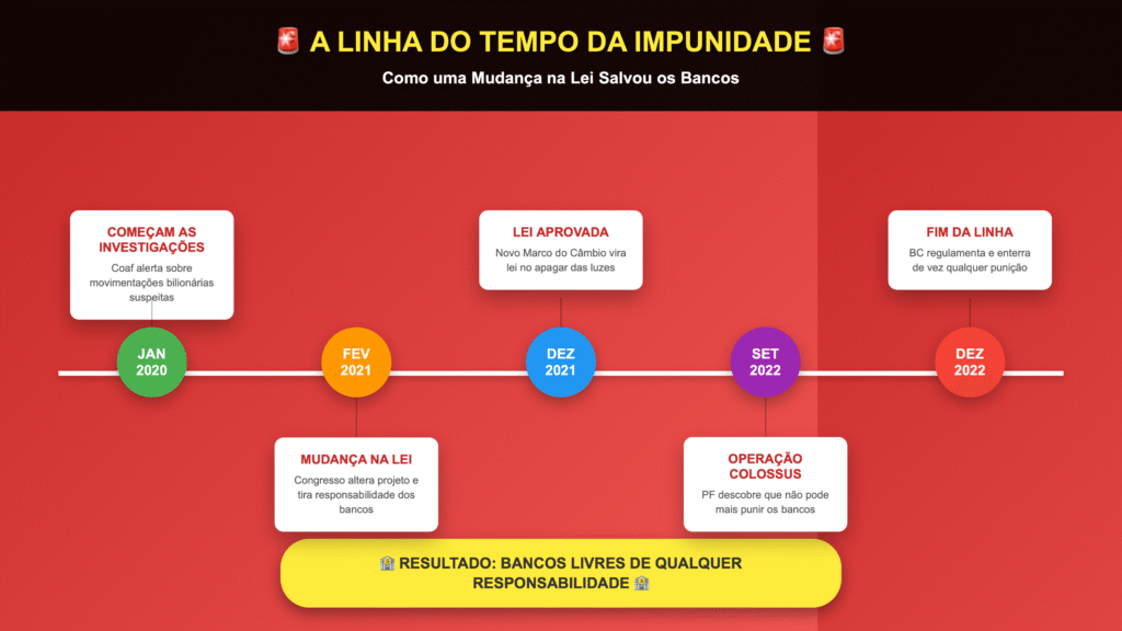 Aqui vem a parte mais impressionante: enquanto a PF investigava, o Congresso mudou a lei do câmbio. A mudança, sugerida pelo próprio Banco Central, tirou dos bancos a responsabilidade de verificar se as operações eram legítimas.
