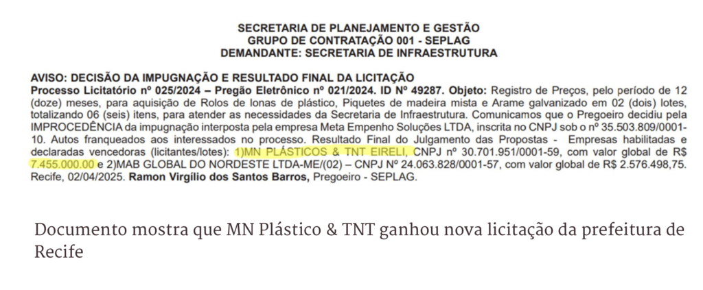 De acordo com o TCE-PE, a MN Plásticos já recebeu R$ 48 milhões em recursos públicos, sendo R$ 20 milhões pagos pela Prefeitura do Recife — seu principal cliente.