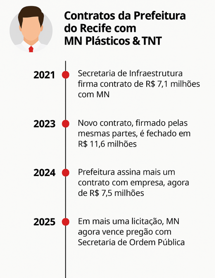 A Prefeitura do Recife, sob a gestão de João Campos (PSB), firmou ao menos R$ 20 milhões em contratos com a empresa MN Plásticos & TNT Ltda, ligada a um empresário investigado por corrupção e proibido de contratar com o poder público. A informação consta em documentos obtidos junto ao Ministério Público Federal (MPF) e ao Tribunal de Contas do Estado de Pernambuco (TCE-PE).