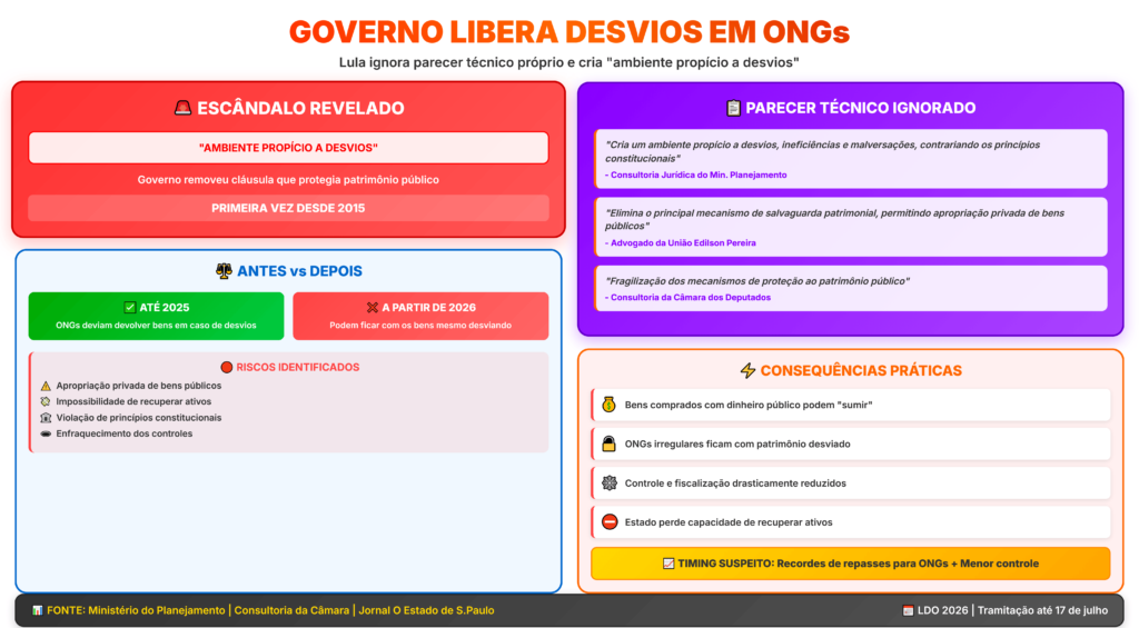 A polêmica está na remoção da “cláusula de reversão patrimonial” da Lei de Diretrizes Orçamentárias (LDO) de 2026 – a primeira vez que isso acontece desde pelo menos 2015. Essa cláusula garantia que bens comprados com dinheiro público tivessem que ser devolvidos ao Estado em casos de desvios ou irregularidades por parte das ONGs.