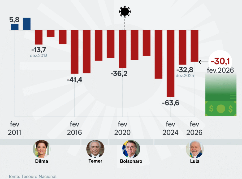 No acumulado do primeiro bimestre de 2026, o governo registrou superávit primário de R$ 57,5 bilhões, o segundo maior da série histórica iniciada em 1997, atrás apenas de 2022.