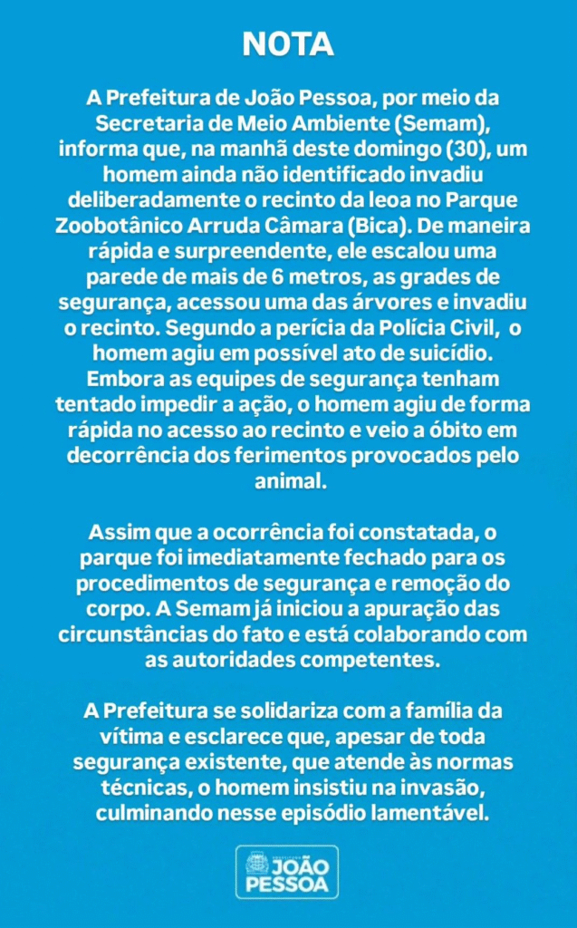Um homem morreu neste domingo (30.nov.2025) após invadir o recinto de uma leoa no Parque Zoobotânico Arruda Câmara, em João Pessoa (PB).