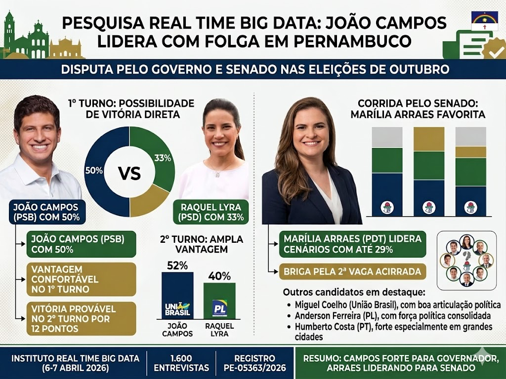 Uma pesquisa divulgada nesta quarta-feira (8) pelo instituto Real Time Big Data aponta que o prefeito do Recife, João Campos (PSB), aparece com ampla vantagem na disputa pelo Governo de Pernambuco e pode vencer as eleições já no primeiro turno.