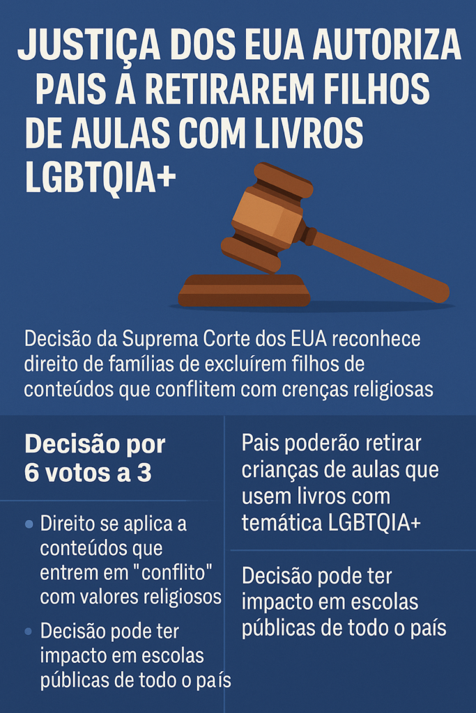 WASHINGTON – A Suprema Corte dos Estados Unidos decidiu nesta sexta-feira, 27, que pais têm o direito de retirar seus filhos de aulas que utilizem livros com conteúdo LGBTQIA+, caso considerem que os materiais violam suas crenças religiosas. A decisão, tomada por 6 votos a 3, representa uma vitória para um grupo de famílias do Condado de Montgomery, no estado de Maryland, e pode ter repercussões em escolas públicas de todo o país.
