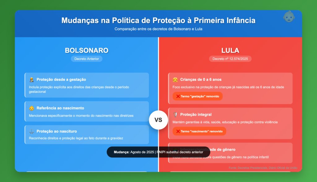 O Decreto nº 12.574/2025, assinado por Lula em agosto, estabelece proteção, desenvolvimento e direitos das crianças de zero a seis anos, mas remove os termos “gestação” e “nascimento” presentes na legislação anterior.