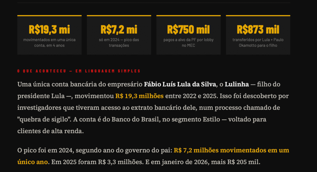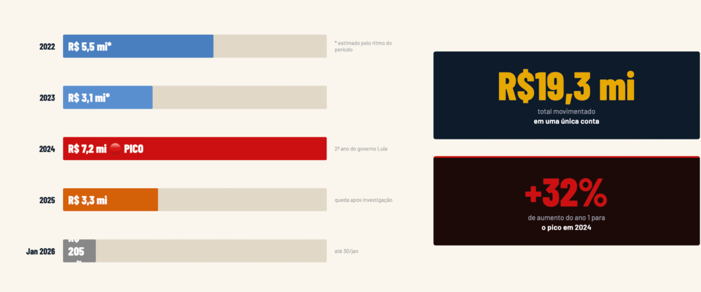 Uma única conta bancária de Fábio Luís Lula da Silva, o Lulinha, filho do presidente Lula (PT), movimentou R$ 19,3 milhões entre 2022 e 2025, segundo quebra de sigilo obtida com exclusividade. O auge das transações ocorreu em 2024, com R$ 7,2 milhões movimentados em apenas um ano.