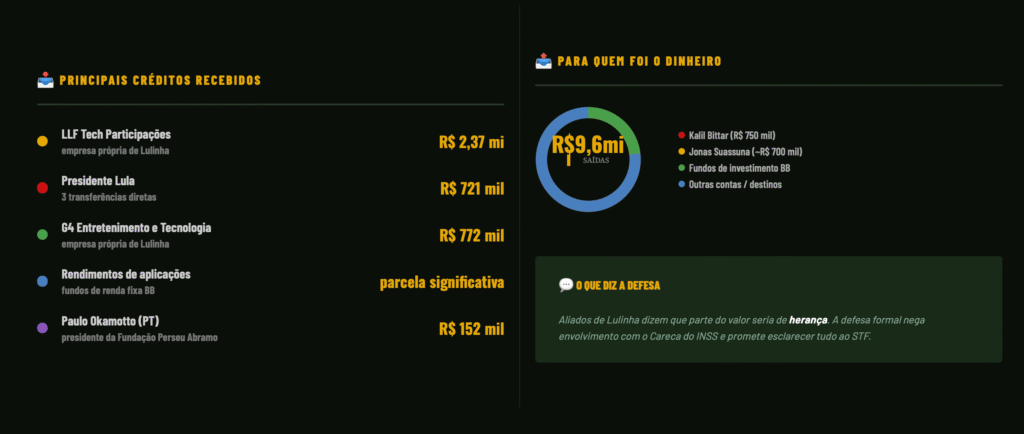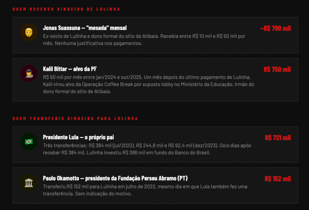 - Jonas Suassuna (ex-sócio e ligado ao sítio de Atibaia): cerca de R$ 700 mil entre 2022 e 2025, em parcelas de R$ 10 mil a R$ 50 mil mensais.