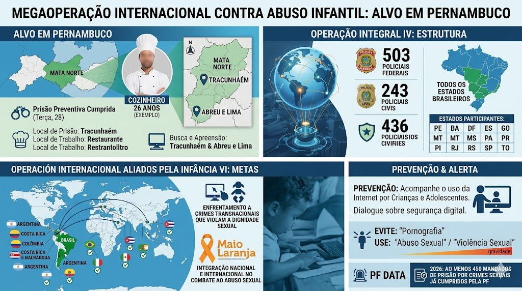 Uma megaoperação internacional contra crimes de abuso sexual de crianças e adolescentes levou à prisão de um homem de 26 anos na Zona da Mata Norte de Pernambuco. O suspeito, que trabalhava como cozinheiro, foi capturado nesta terça-feira (28) no município de Tracunhaém.