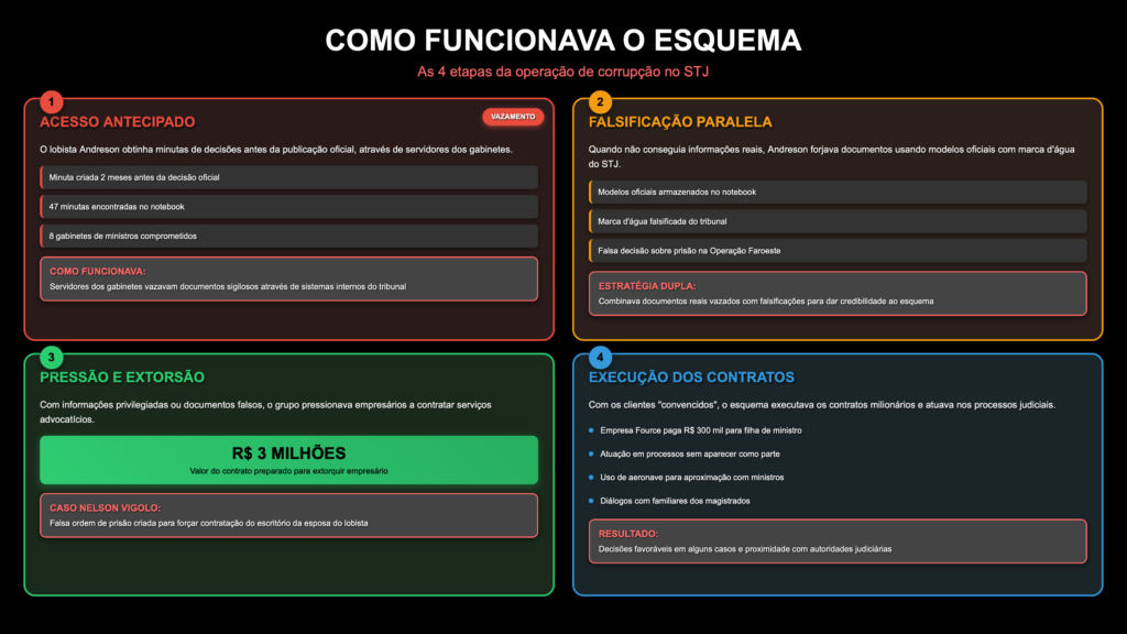 Segundo os investigadores, além de ter acesso a minutas semelhantes às decisões oficiais, o lobista chegou a forjar documentos do STJ para tentar atrair clientes, incluindo uma falsa decisão de prisão atribuída ao ministro Og Fernandes.