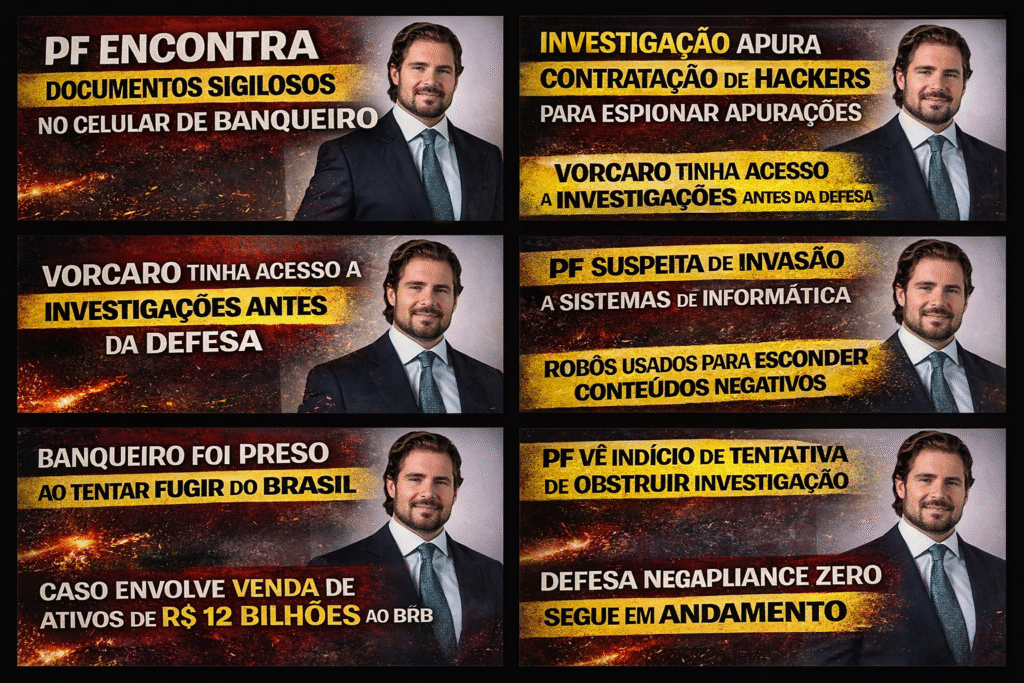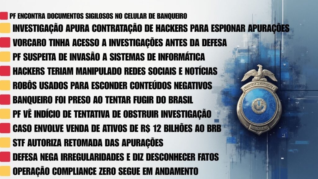 A Polícia Federal encontrou documentos sigilosos de investigações em andamento no celular do banqueiro Daniel Vorcaro, dono do Banco Master, e apura indícios de que ele teria encomendado a contratação de hackers para acessar sistemas de informática e obter informações protegidas por sigilo judicial.