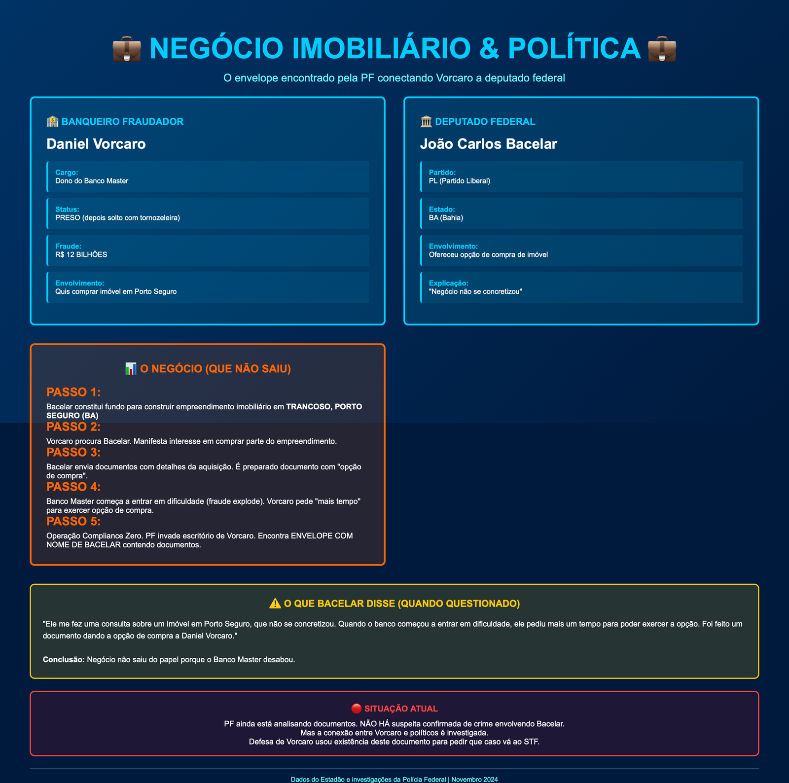 A Polícia Federal apreendeu, durante a Operação Compliance Zero, um envelope com o nome do deputado federal João Carlos Bacelar (PL-BA) em um endereço ligado a Daniel Vorcaro, dono do Banco Master. O material continha documentos de um possível negócio imobiliário envolvendo um empreendimento em Trancoso (BA).