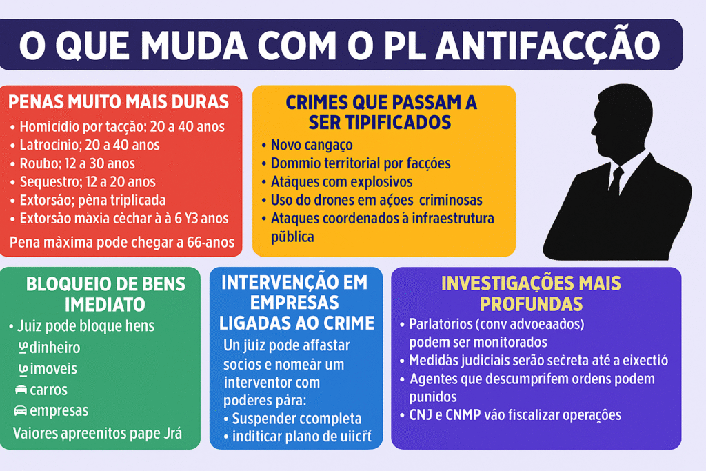 O texto, relatado pelo deputado Guilherme Derrite (PP-SP) — secretário licenciado da Segurança Pública de Tarcísio de Freitas — endurece penas, cria novos tipos de crime, restringe progressão de regime e amplia o poder de bloqueio de bens ligados a facções e milícias.