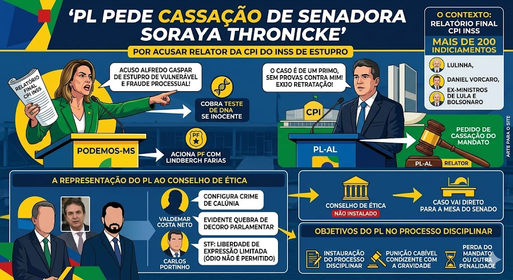 O Partido Liberal (PL) decidiu pedir a cassação do mandato da senadora Soraya Thronicke (Podemos-MS) após ela acusar o relator da CPI do INSS, Alfredo Gaspar (PL-AL), de estupro de vulnerável e fraude processual durante a leitura do relatório final da comissão.