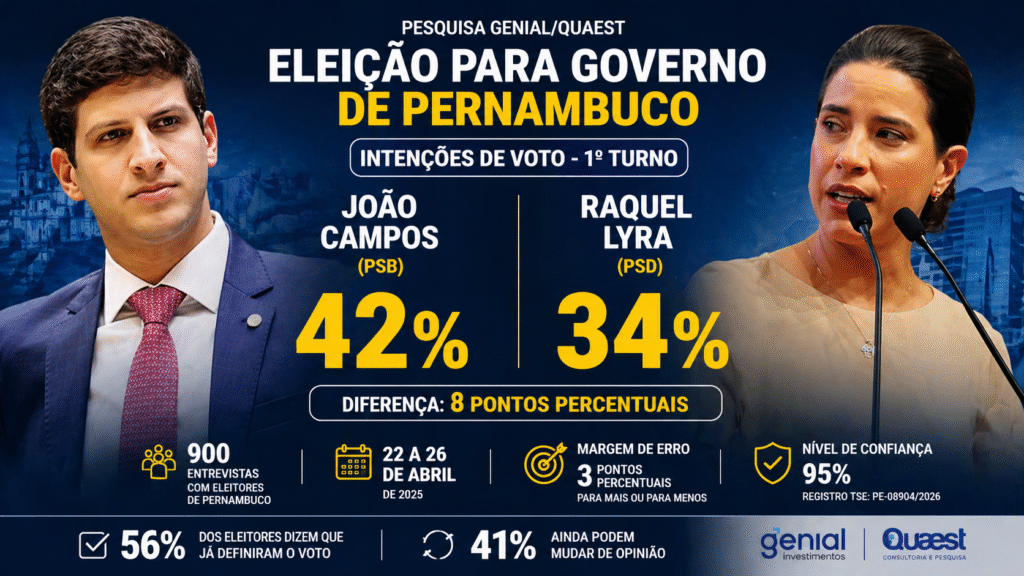 Pesquisa Quaest divulgada nesta terça-feira (28) revela um cenário de forte polarização na corrida pelo Governo de Pernambuco. O ex-prefeito do Recife, João Campos (PSB), lidera com 42% das intenções de voto no primeiro turno, seguido pela governadora Raquel Lyra (PSD), que aparece com 34%.