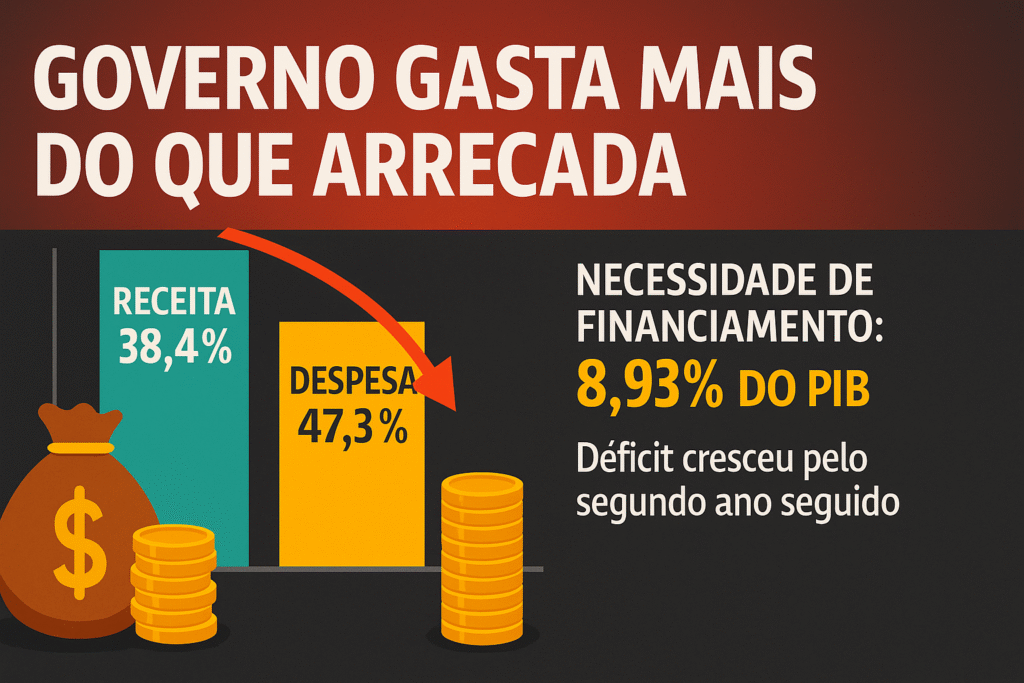 O governo brasileiro está gastando muito mais do que arrecada – e a situação piorou. No segundo trimestre de 2025, para cada R$ 100 que o Brasil produziu, o governo precisou pegar emprestado R$ 8,93 para fechar as contas. É como se uma família que ganha R$ 5.000 por mês estivesse gastando R$ 5.446 – precisando pedir dinheiro emprestado todo mês para cobrir a diferença.