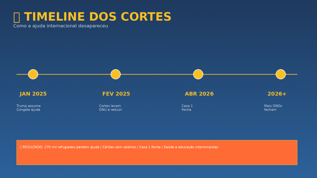 Organizações humanitárias que ajudam refugiados e pessoas vulneráveis no Brasil estão fechando em 2026 porque o governo americano cortou a ajuda internacional. Funcionários trabalham sem salário. Centenas de milhares de pessoas vão perder acesso a comida, documentação, educação e saúde.