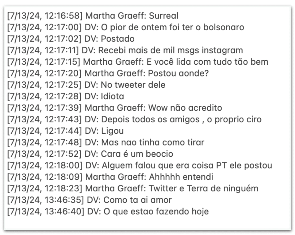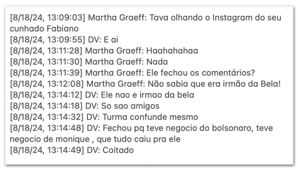 Em conversa com sua namorada, Martha Graeff, Vorcaro chamou Bolsonaro de “beócio” e reclamou da repercussão da publicação: “O pior de ontem foi o Bolsonaro [ter] postado. Recebi mais de mil msgs no Instagram. Idiota”, escreveu em 13 de julho de 2024.