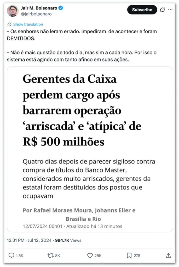 O post de Bolsonaro citava reportagem do jornal O Globo que mostrava a demissão de gerentes da Caixa depois que eles impediram uma operação de R$ 500 milhões envolvendo títulos do Master, considerada “arriscada” e “atípica”.